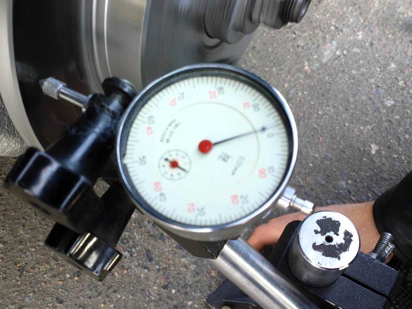 Эта величина важна при определении изношенности. Если геометрия диска нарушена и он искривлен, то появляется биение по оси и торможение будет неравномерным. Биение проверяется специальным прибором во время вращения ступицы колеса.