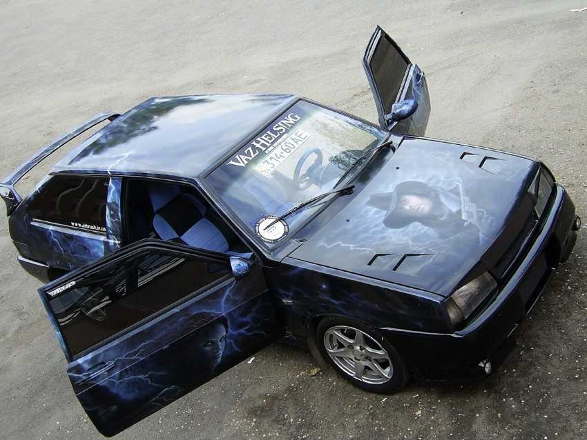 Аэрография выгодно отличает автомобиль в общем ряду собратьев. Это подходит любителям изобразительного искусства. Виниловая пленка, всевозможные наклейки, жидкая резина – плохой вкус. Водители отказываются от такого бюджетного тюнинга, предпочитая аэрографию. Она превращает «девятку» в эксклюзив. Обращаются в мастерскую с соответствующим оборудованием, так как дешевый краскопульт в руках тюнера-любителя может испортить дело – рисунки получаются размытыми.