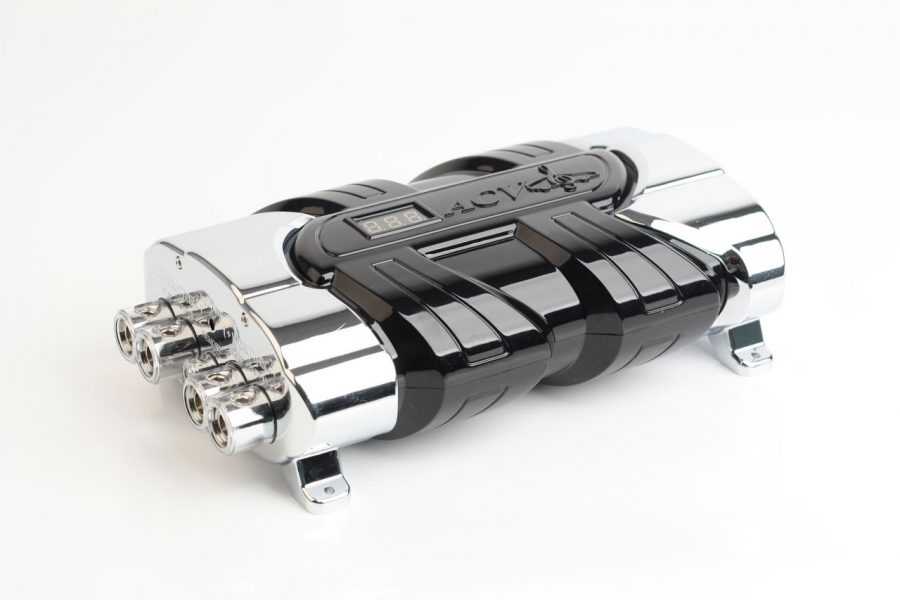 Самый полный на сегодня контроль напряжения и параметров работы, а также возможность прямого управления со стороны усилителя — две яркие черты, которые выделяют данную модель конденсатора. Она понравится пользователям, желающим создать действительно мощную систему. Емкости в 5Ф хватит для акустики в 5 кВт.