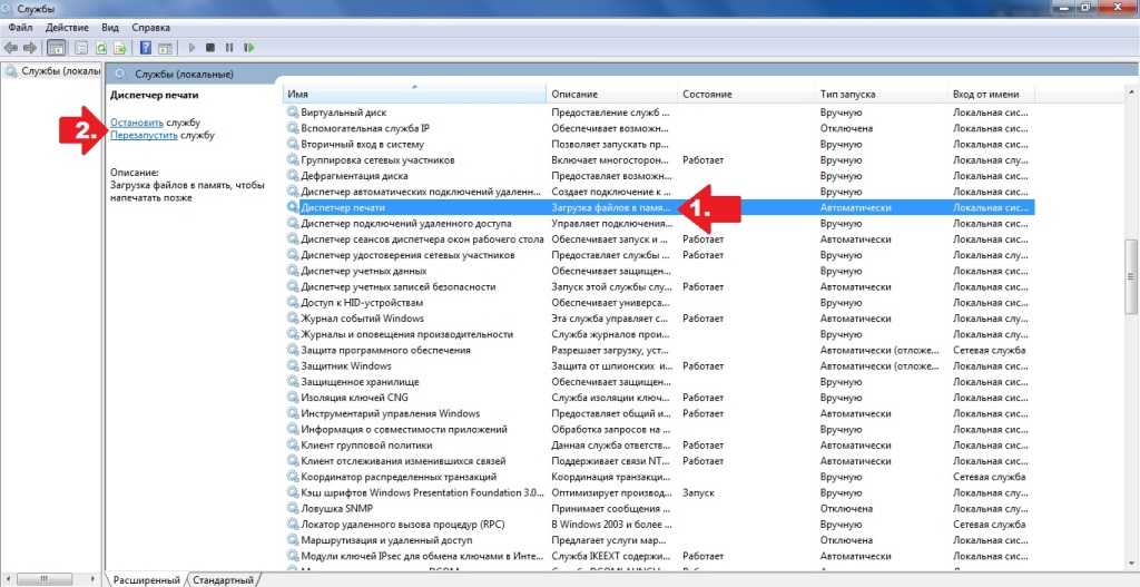 Во-первых, попробуйте поискать службы под названием Printer Spooler. Это она и есть, только в англоязычном варианте. Нашли? Тогда ура, дальше работаем с ней.