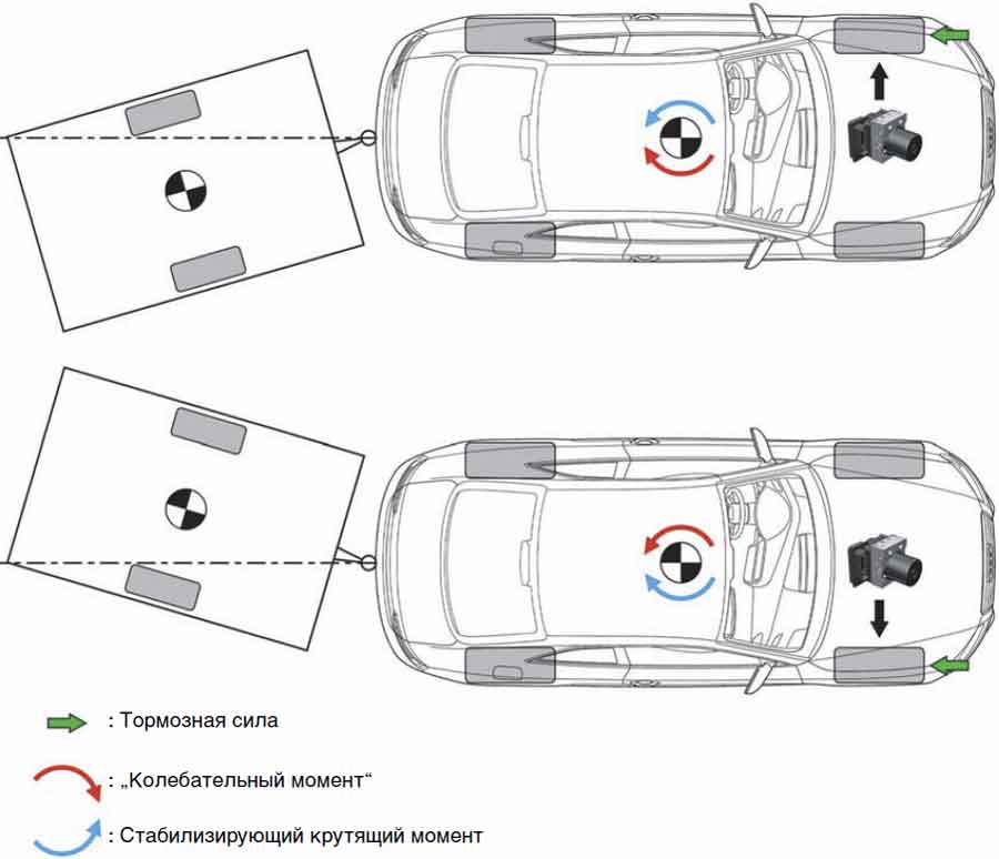 Путем передачи тормозного усилия на соответствующее переднее колесо создается крутящий момент относительно вертикальной оси автомобиля, противодействующий „колебательному моменту“. Преимуществом этой стратегии регулировки является отсутствие необходимости сильного снижения скорости автомобиля для стабилизации прицепа.