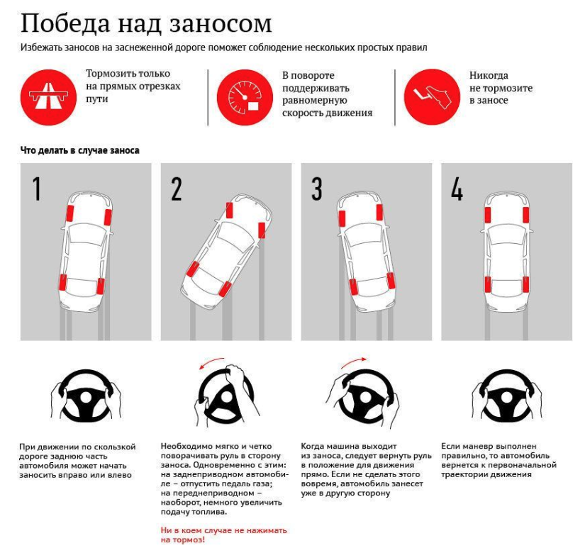 Важно не пропустить момент, когда машину еще можно «поймать», быстро повернув руль в сторону заноса. Если же она уже начала разворачиваться, лучше этого не делать — можно усугубить ситуацию