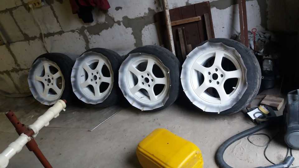 - С колес снимаются покрышки. В крайних случаях можно не снимать резину, но тогда всю поверхность покрышки необходимо хорошо заклеить при помощи газет и скотча;