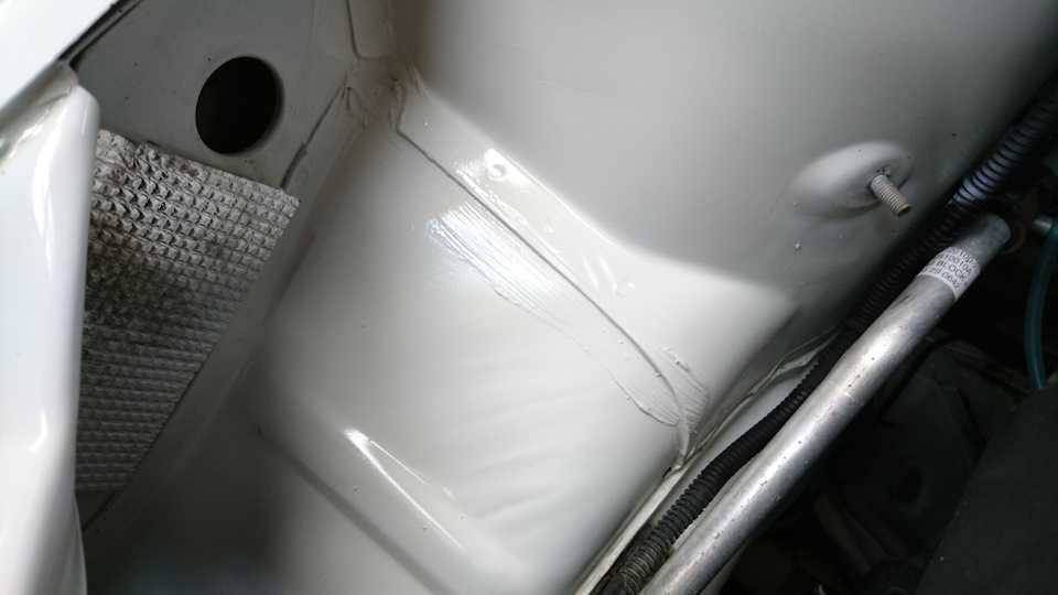 - Если трещина или дырочка небольшая, то можно попытаться обработать ее обычным герметиком. В данном случае процедура ремонта выглядит аналогично — поверхность сначала вымывается, а затем обезжиривается. На дыру наносится определенным объем герметика, который должен полностью забить трещину и пространство вокруг нее.