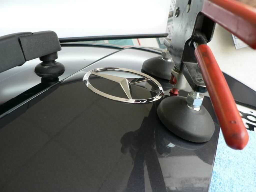 - Клеевой метод проводят при помощи специальных инструментов, которые в прямом смысле слова вытягивают вмятую поверхность обратно. Для этого на поврежденный участок наклеиваются специальные пистоны, которые впоследствии вытягивают вверх, а они в свою очередь тянут за собой поверхность корпуса.