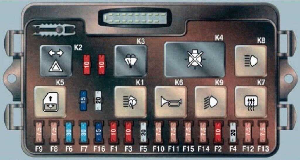 - поломку предохранителя. Чтобы не попадать в ситуацию, когда перестало функционировать аварийное освещение, найдите предохранитель, отвечающий за повороты (например, К2). Далее вам потребуется просто заменить его. Помимо выхода из строя предохранителя вы можете столкнуться с проблемой замены его контактов;