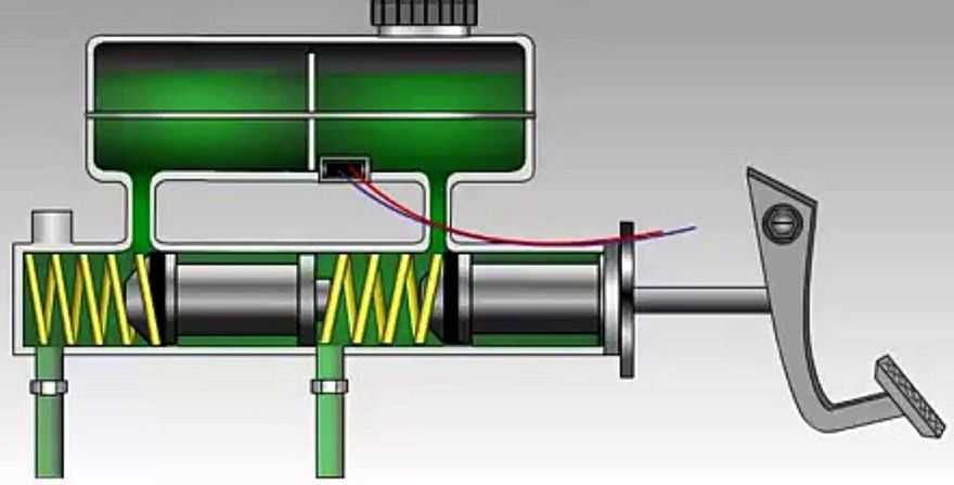- Когда водитель отпускает педаль, пружины выталкивают поршни обратно, возвращая в первоначальное положение. Жидкость из трубок и бачка снова наполняет цилиндры.