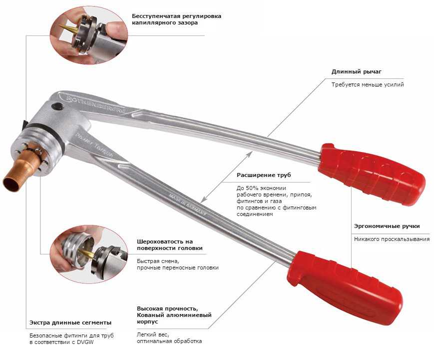 Гораздо более предсказуемые результаты получаются при использовании экспандера. Здесь также нужно будет применять физическую силу, но сам процесс упрощается, поскольку натяжка трубы на одну из сменных насадок осуществляется с помощью вращающейся рукоятки.
