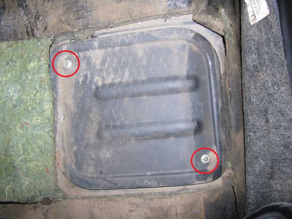 - Под обивкой, ближе к правой части авто, открутить крестовой отверткой два винта и снять технологический лючок, под ним будет топливный бак и верх бензонасоса.