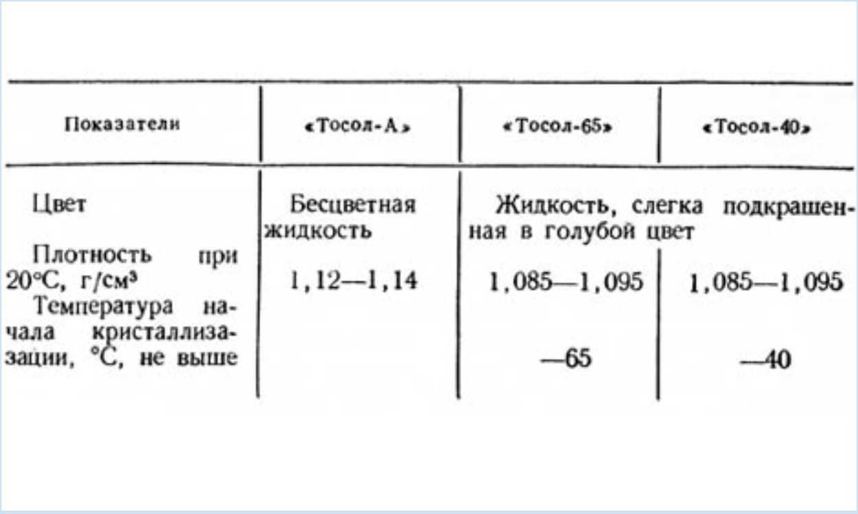 Охлаждающая жидкость имеет специфический запах и определенный оттенок. За счет особых химических компонентов, входящих в состав тосола, он остается в жидком состоянии даже при минусовой температуре