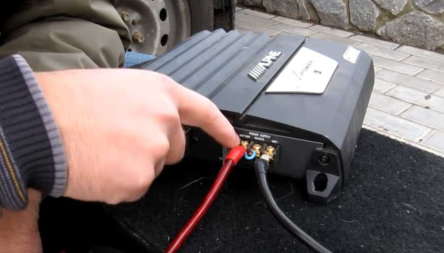 - После подключается питание: силовой кабель прокладывается под обшивкой салона и подсоединяется на «+» — клемму АКБ одним краем, а второй подключается к сабу.