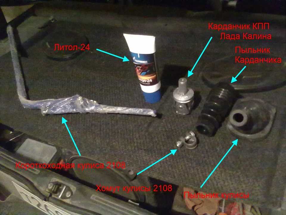 2. Приветствуется:— Пыльник шарнира Лада Калина (От 2108 меньше. Но натянуть можно. Рекомендуется к замене)— Пыльник кулисы (По желанию, у меня был порван)— Литол-24 (густая смазка, пригодится)— Хомут кулисы (Замена для профилактики)— Опора ручки КПП (пластик)
