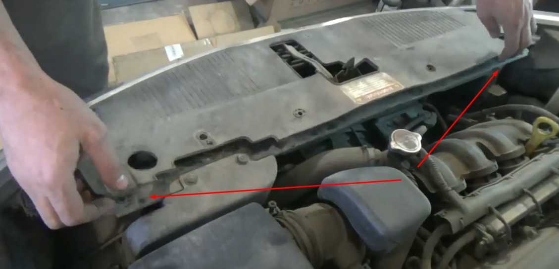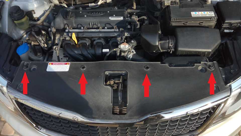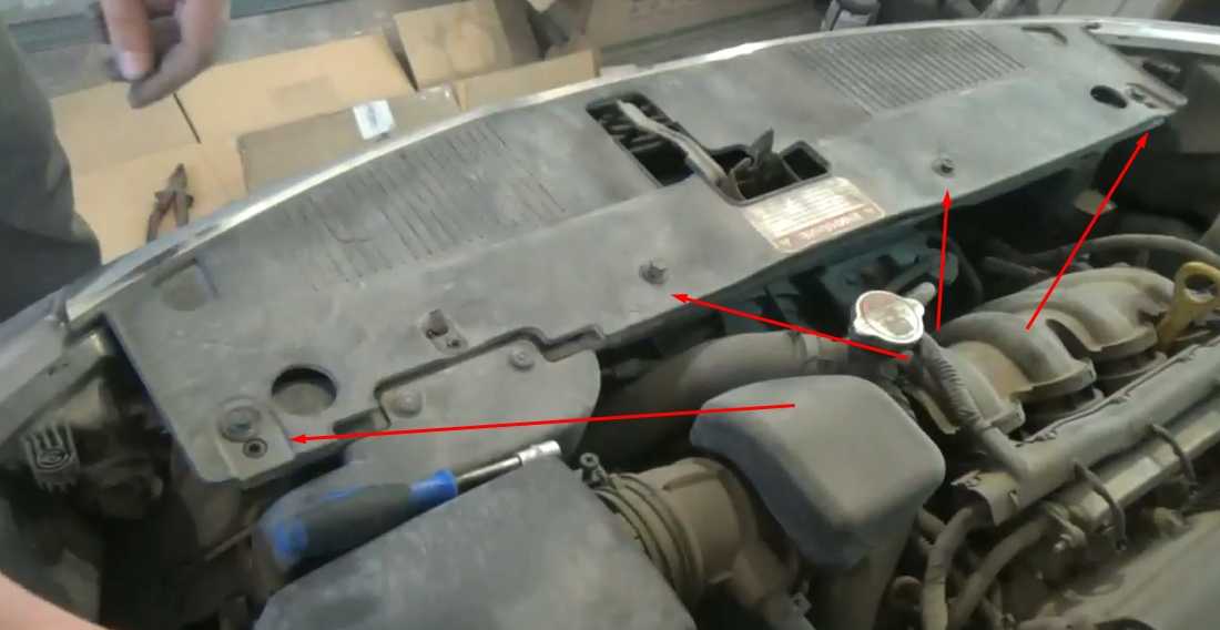 - Первый шаг – открепить четыре клипсы (защелки), которые удерживают внешний кожух решетки радиатора в верхней части автомобиля.