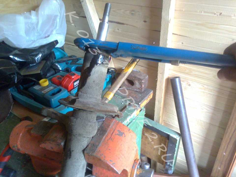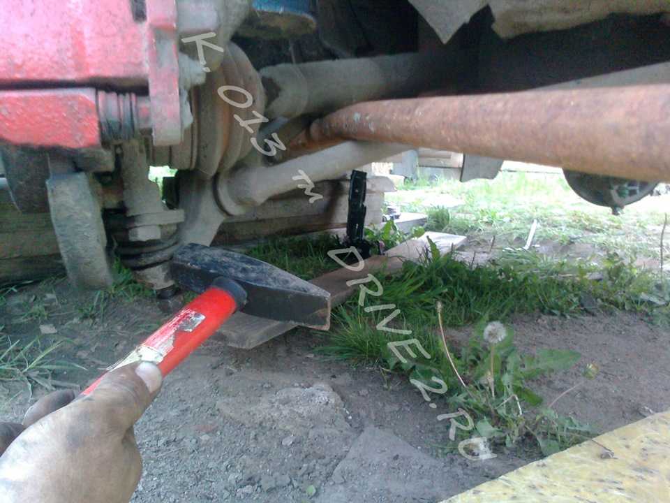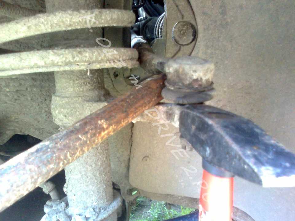 Съемником выпрессовываем палец из рычага.При отсутствии съемника гайку отворачиваем не до конца, вставляем монтажную лопатку в распор между рулевой тягой и рычагом стойки и молотком наносим удары по торцу рычага стойки.