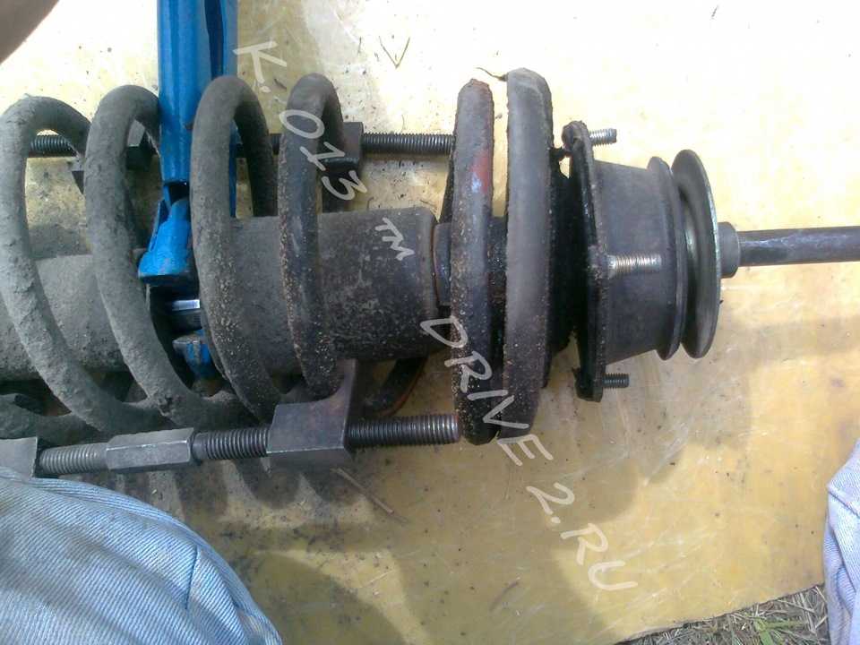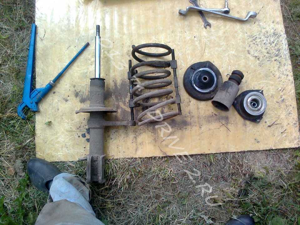 После выкрутите три гайки, которыми закреплен опорный подшипник к стакану на кузове автомобиля. При помощи ключей на «19» и «17» выкручиваете два нижних болта крепления стойки к поворотному кулаку. Только после этого можно вынуть всю стойку в сборе. Сжав пружину, можно разобрать полностью узел и произвести его ремонт. Но нужно подумать, стоит ли производить ремонт амортизатора. Стоимость комплекта для ремонта довольно высокая, самостоятельно выполнить работы сможет далеко не каждый. А поставить новую стойку — это дело нескольких минут.