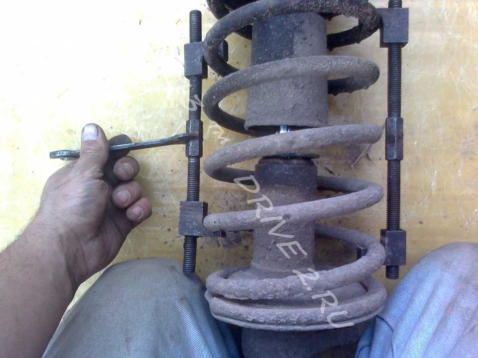 Для замены пружин и амортизаторов передней подвески снимаем и разбираем направляющую пружинную стойку.