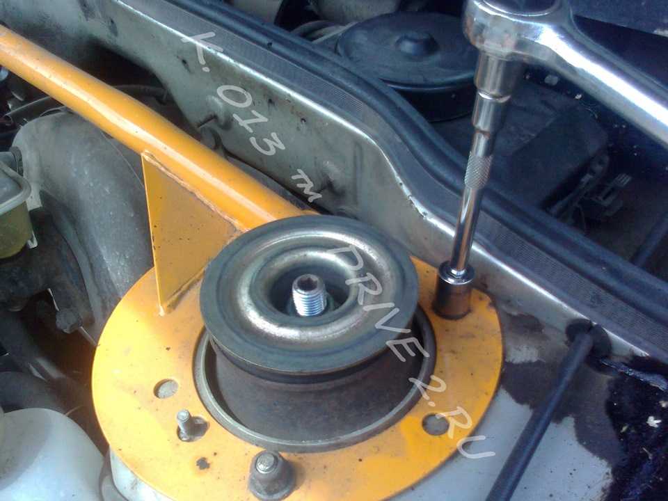 При последующей установке направляющей пружинной стойки совмещение меток не гарантирует точной установки заданного угла развала колеса, но позволяет добиться небольшого отклонения от первоначального значения.Головкой «на 19» отворачиваем гайку верхнего болта, удерживая болт от проворачивания ключом той жеразмерности.