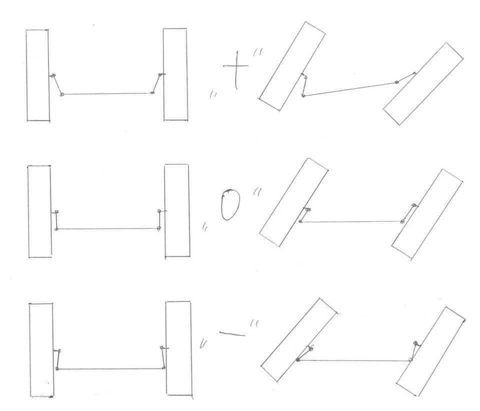 Этот параметр подвески вступает в силу, когда мы начинаем крутить руль. При нулевом угле Аккермана, левое и правое колеса будут поворачиваться под одним углом (параллельно).