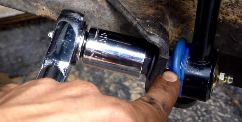 - Теперь можно гайки стойки стабилизатора открутить до конца, а втулку снять – она снимается легко, т. к. является разрезной.