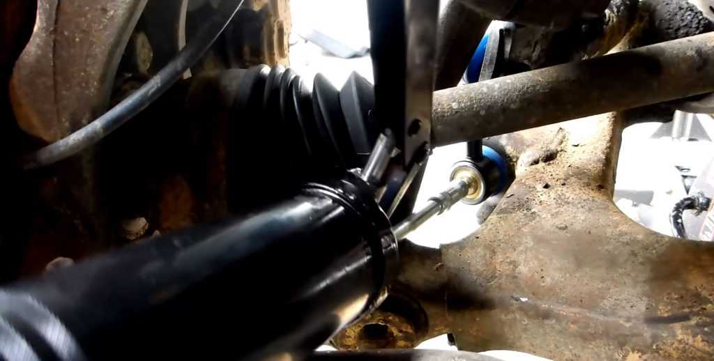 Как и при диагностике, при замене необходимо вывесить оба колеса оси. Если «поддомкратить» только одну сторону, то стабилизатор окажется в «напряжении», и вам будет сложно вытащить и установить на место тягу.